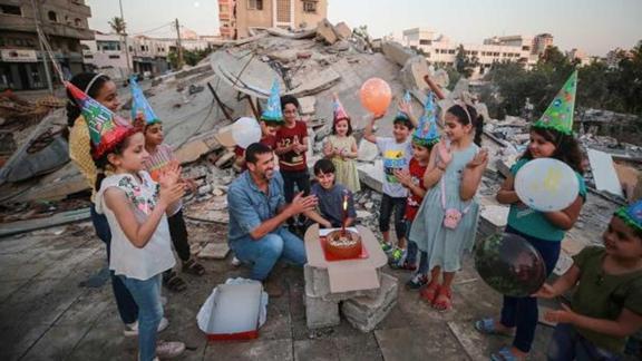 İsrail'in Gazze Şeridi'ne düzenlediği saldırılarda evleri yıkılan Filistinli aile, 13 yaşındaki oğulları Mahmud'un doğum gününü evlerinin enkazı üzerinde kutladı.