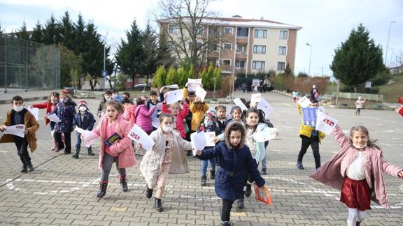 Karnelerini aldıktan sonra bahçeye çıkarak ailelerine gösteren öğrencilerin heyecanları yüzlerine yansıdı.
