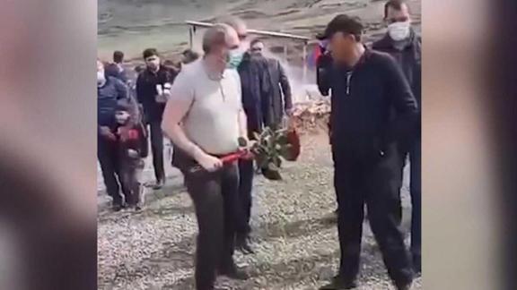 DHA'da yer alan habere göre, Dağlık Karabağ savaşında ölen bir Ermeni askerinin mezarına çiçek bırakmak isteyen Paşinyan'a askerin ağabeyi önce tepki gösterdi, daha sonra da mezara çiçek bırakılmasını engelledi.