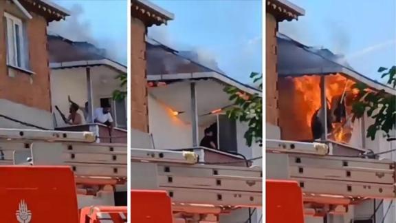Cep telefonu görüntülerinde, binanın çatısını saran alevler balkon tavanının çökmesine neden olurken, balkonda içeri giren 3 kişi ölümden kıl payı kurtuluyor.