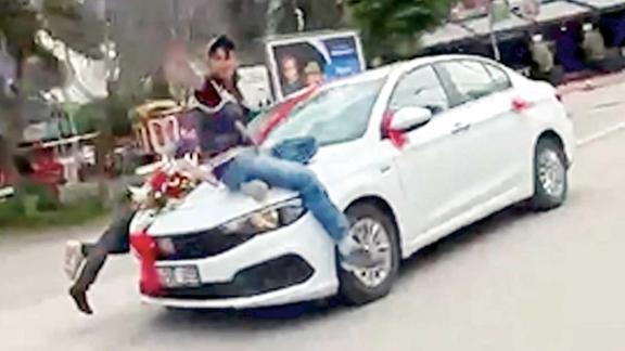 Adana Çukurova'da gelin arabasının etrafını saran 4 genç, sürücüden bahşiş istedi, ancak istedikleri olmayınca şahıslardan 2'si aracın ön kaputuna oturdu.
