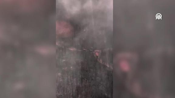 Görüntülerde orman içindeki yolda duran araçlar ve çevresinde tamamen yanan ağaçlar yer aldı.