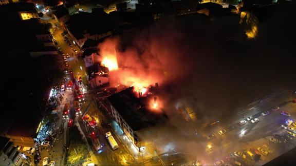 Restoranın yanındaki binaların çatısına da sıçrayan ve kontrol altına alınan yangına, itfaiye ekiplerinin çalışması sürüyor.