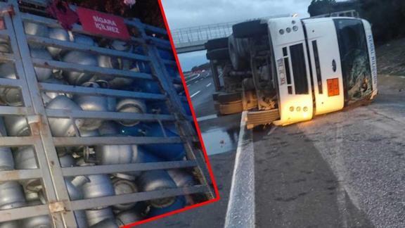 Kırklareli'nin Lüleburgaz ilçesinde mutfak tüpü yüklü kamyon yoldan çıkarak devrildi. Otoyolda meydana gelen kazada tüplerin patlamaması faciayı önlerken, itfaiye ekipleri bölgede güvenlik önlemi aldı.
