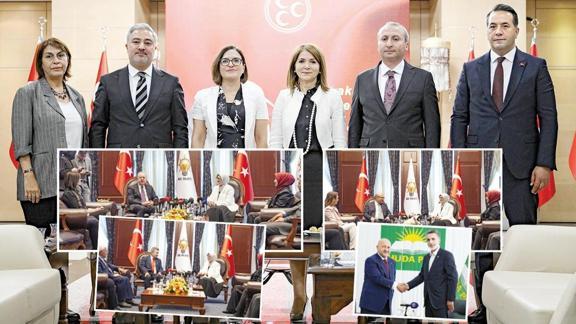 DEM Parti Van Milletvekili Zülküf Uçar, Dil ve Kültür Komisyonu Eş Sözcüsü Cemile Turhallı Balsak ile PM Üyesi Fatma Koçyiğit Öner'in bulunduğu konuk heyet, MHP Genel Başkan Yardımcısı Zühal Topcu, Merkez Yönetim Kurulu üyeleri Turan Şahin ile Özmen Alp Giray Erdemir'den oluşan MHP heyeti ile bayramlaştı.