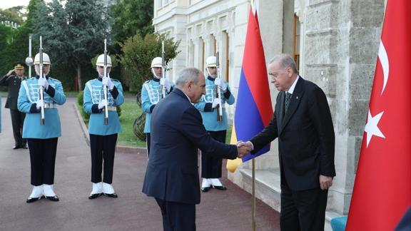 Başkan Erdoğan, dün Dolmabahçe Çalışma Ofisi'nde, Ermenistan Başbakanı Paşinyan'ı resmi törenle karşıladı. Tören sonrası Başkan Erdoğan ile Paşinyan birbirlerine heyetlerini takdim ederek görüşmeye geçti. Kabulde Türkiye ile Ermenistan arasındaki temaslar başta olmak üzere, Güney Kafkasya'daki barış ve diyalog süreci ile bölgeyi ilgilendiren güncel gelişmeler ele alındı.