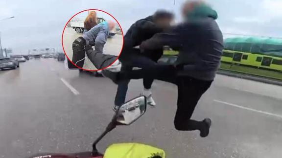 Bursa-İzmir yolu üzerinde 'yol verme' meselesi nedeniyle iki sürücü arasında tartışma çıktı. Araçlarından inen taraflar birbirlerine uçan tekmeyle saldırdı. Korku dolu anlar kameraya yansırken, tarafları yoldan geçen kurye ve çevredeki sürücüler ayırdı. Görüntüler üzerine harekete geçen Bursa İl Emniyet Müdürlüğü ekipleri, kavga eden sürücülerin Serkan K. ile Emirhan A. olduğunu tespit etti. İki sürücü gözaltına alındı. Polis ekiplerince sürücülere toplamda 13 bin lira idari ceza uygulandı.