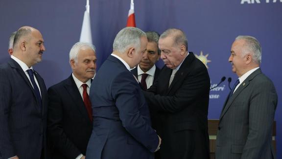 Başkan Erdoğan, grup toplantısının ardından, AK Parti'ye geçen 7 belediye başkanına rozetlerini taktı.