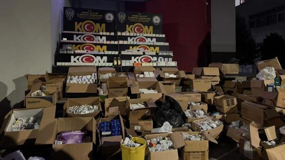 Ruhsatsız depoya operasyon düzenleyen ekipler, İl Sağlık Müdürlüğü personeliyle yaptıkları incelemede reçeteye tabi 1 milyon 123 bin 443 ilaç ele geçirdi.