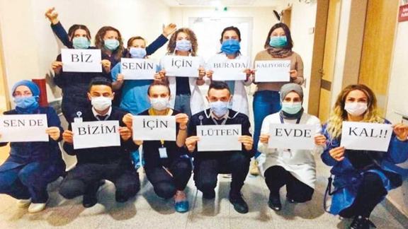 Sağlık çalışanları “Biz senin için burada kalıyoruz. Sen de bizim için lütfen evde kal” notlarını paylaşarak vatandaşlardan zorunlu olmadıkça dışarı çıkmamalarını istedi.