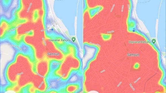 Samsun'da ‘Hayat Eve Sığar Uygulaması'ndan (HES) 31 Ağustos ve 26 Kasım tarihlerinde 3 ay zaman aralığıyla alınan görüntüler korona virüsünde vaka artışlarını gözler önüne serdi. 3 ay önce diğer renklerin de görülebildiği haritada şimdilerde ‘yüksek risk'i temsil eden kırmızı renk yoğunluğu dikkat çekiyor. Şehir, uygulamadan bakıldığında kıpkırmızı halde bulunuyor.