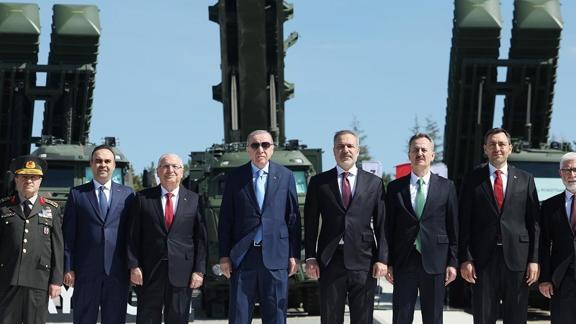 Türkiye'nin savunma gücüne dikkat çeken Erdoğan, şunları kaydetti: "Bugün Türkiye kendi semalarını koruyan, kendi mühimmatını geliştiren bir ülkedir. Dahası tüm bunları kendi aklımız, mühendisliğimiz ve insan kaynağımızla yapabiliyoruz. Talep etmeleri durumunda dost ve müttefiklerimizin yardımına koşuyor, küresel barış ve güvenliğe en yüksek düzeyde katkı sunuyoruz. Bugün savunma sanayii alanında dünyada parmakla gösterilen bir seviyede yer almanın haklı gururunu yaşıyoruz. Bugün etrafımızda füzeler ve dronlar uçuşurken biz kendimizi güvende hissediyor, gece yastığa başımızı gönül huzuruyla koyabiliyoruz. Allah korusun başımıza bir şey gelse başkasına değil, her şeyden önce kendi bileğimizin gücüne güveniyoruz. Bunları sadece biz değil hasımlarımız da gayet iyi biliyor."
