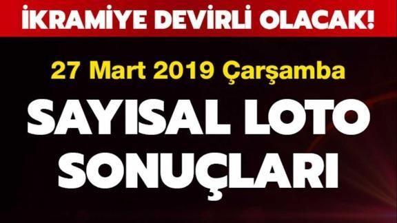 27 Mart Sayısal Loto çekiliş sonuçları açıklandı. Haftanın sonuçlarına göre 2. kez devir yaşandı ve 2.527.396,28 TL değerindeki ikramiye gelecek haftaya devretti. 5 bilen 94 kişi 4.542,00 TL, 4 bilen 4.497 kişi 71,80 TL, 3 bilen 81.451 kişi ise 11,10 TL ikramiye kazandı.