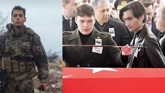 Şehidin üniversite öğrencisi kardeşi Eren Emir, ağabeyinin üniformasını giyip subay kılıcını tabutun üzerine bıraktı.
