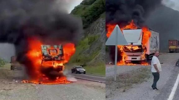 Zonguldak'ın Gökçebey ilçesinde seyir halinde alev alan tır yandı. İtfaiyenin müdahalesiyle yaklaşık yarım saatte söndürülen yangın, cep telefonu kamerasına yansıdı.