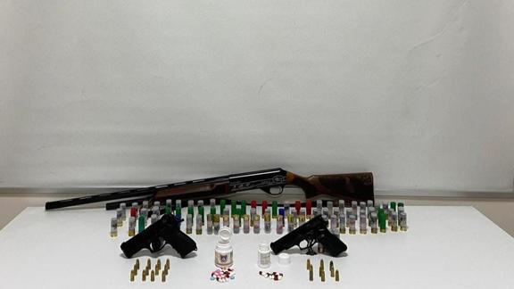 E.S'nin ikametine operasyon düzenleyen ekipler, 1 ruhsatsız tabanca, 1 faturasız kurusıkı tabanca, 1 ruhsatsız av tüfeği, 21 tabanca mermisi, 69 av tüfeği kartuşu ve 61 sentetik ecza hapı ele geçirdi.
