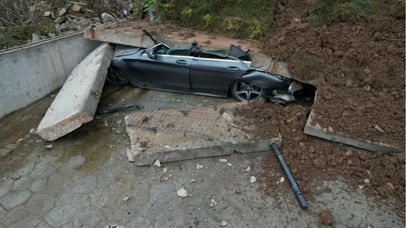 Olayda herhangi bir can kaybı veya yaralanma yaşanmazken, park halindeki yaklaşık 3 milyon değerindeki Mercedes marka otomobil çöken istinat duvarının altında kalarak pert oldu.