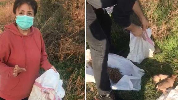 İHA'da yer alan habere göre, İnegöl’de ikamet eden ve hayansever dostu olarak tanınan Hatice Terkenli bir grup arkadaşıyla sokak hayvanlarını beslemek için gezdiklerinde Yenişehir ilçesi Ayaz mahallesi yakınlarındaki boş bir arazide çuvallardan sesler geldiğini fark ettiler.