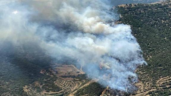 İzmir'in Seferihisar ilçesinde ormanlık alanda çıkan yangına havadan ve karadan müdahale ediliyor.