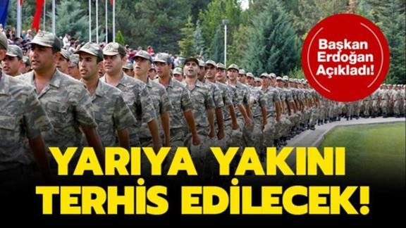 Yeni askerlik kanunuyla yükümlülerin yarıya yakınının hemen terhis olacağını, kalanların görevlerine devam edeceğini kaydeden Erdoğan, "Yükümlü askerlikle ilgili sıkıntılar ve ihtiyaçlar varsa çözüm ürütmek, ülkenin yöneticileri olarak bizim asli görevimizdir." dedi.