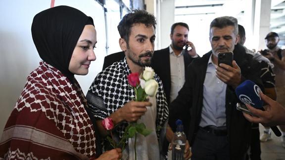 Şuayb Ordu, çıkışta eşine uzun süre sarılırken, Filistin destekçileri Ordu ve Acar'a çiçekler verip Filistin'e destek sloganları attı.