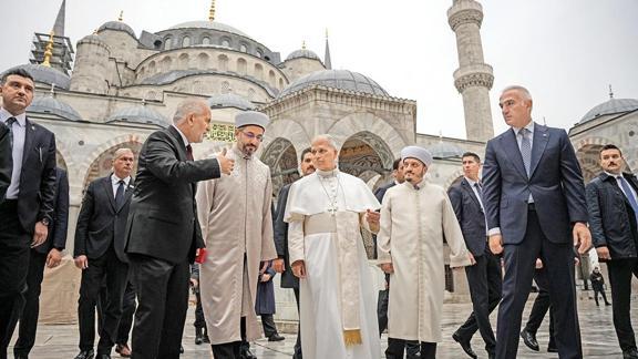 Başkan Recep Tayyip Erdoğan'ın resmi daveti üzerine Türkiye'ye gelen Papa 14. Leo'nun İstanbul'daki ziyaretleri dün de sürdü. Geceyi Şişli'deki Saint Esprit Katedrali'nde geçiren Papa 14. Leo'nun ilk durağı Sultanahmet Camii oldu. Papa'yı Kültür ve Turizm Bakanı Mehmet Nuri Ersoy, İstanbul İl Müftüsü Doç. Dr. Emrullah Tuncel, Sultanahmet Cami imamı Fatih Kaya, müezzin Musa Aşgın Tunca ve diğer yetkililer karşıladı. Papa, camiye girmeden ayakkabılarını çıkardı. Sultanahmet Camii müezzini Musa Aşgın Tunca, Papa 14. Leo'ya camiyi anlattı. Yaklaşık yarım saatlik ziyaretin ardından Papa, Yeşilköy'deki Mor Efrem Süryani Ortodoks Kilisesi'ne geçmek üzere ayrıldı.