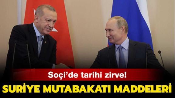 Türkiye ile Rusya arasında Soçi’de gerçekleşen zirve sonrasında ‘Suriye mutabakatı nedir?’ sorusu aratılmaya başladı. Türkiye güvenli bölge konusundaki kararlı tavrı ve duruşu devam ediyor. Bu amaçla Başkan Recep Tayyip Erdoğan ve Rusya Lideri Putin arasında Soçi'de gerçekleştirilen zirvede terör örgütlerinin bölgeden uzaklaştırılması ve güvenli bölgenin oluşturulması hususunda gerekli kararlar alındı. Peki, Suriye mutabakatı maddeleri neler? İşte cevabı…