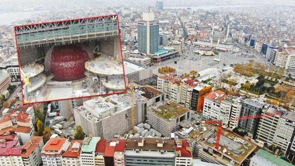 İlk AKM’nin mimarı olan Hayati Tabanlıoğlu’nun oğlu mimar Murat Tabanlıoğlu imzasını taşıyan yeni Atatürk Kültür Merkezi’ndeki işçilerin hummalı çalışması devam ediyor. 5 bloktan oluşacak AKM binasının havadan çekilen görüntülerinde küre şeklinde tasarlanan oditoryumun, dış cephesinin tamamının kırmızı taşlarla kaplandığı görüldü. Korona virüs önlemleri alınarak sürdürülen binanın inşaatını, 30 Ekim’de ziyaret eden Başkan Erdoğan ise binanın Haziran 2021’in sonuna kadar yetiştirilme hedefi olduğunu belirtmişti.
