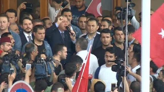 Cumhurbaşkanı Erdoğan ve ailesi, Atatürk Havalimanı Hava Trafik Kontrol Kulesi'nin darbeci askerlerden geri alınarak kontrolün sağlanmasının ardından Dalaman Havalimanı'ndan özel 'TC-ATA' tescilli uçakla Atatürk Havalimanı'na geldi. Coşkulu bir kalabalık Erdoğan'ı 'Dik dur eğilme bu millet seninle' sloganlarıyla karşıladı. Vatandaşların, Erdoğan'ın içinde bulunduğu araca doğru yönelmesiyle izdiham yaşandı. Erdoğan burada vatandaşlara "Milletin üzerinde hiçbir güç yoktur. Bu bir ayaklanma, ihanet, vatana ihanet hareketidir. Bunun bedelini çok ağır ödeyecekler" diye seslendi. Erdoğan'ın korumalarının üzerlerinde çelik yelekler ve ellerinde de otomatik silahlar bulunduğu görüldü. Erdoğan'ın damadı ve dönemin Enerji Bakanı Berat Albayrak vatandaşlardan yolu açmalarını istedi. Erdoğan'ın havalimanındaki devlet konukevine geçtigi dakikalarda darbecilerin kullandığı F-16'lar havalimanı üzerinde uçuyordu.