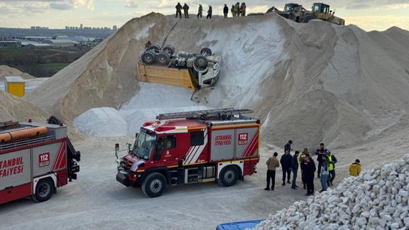 Muratbey Merkez Mahallesi Bilir Caddesi'nde bulunan taş ocağında kum yüklenen hafriyat kamyonu henüz bilinmeyen nedenle devrildi. Sürücü Şaban S. (64) kamyonun kasası ve şasisi arasında sıkıştı.