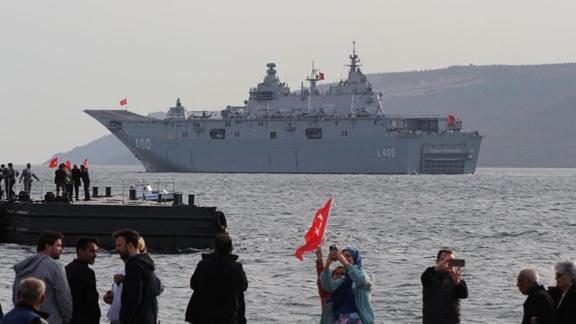 18 Mart Şehitleri Anma Günü ve Çanakkale Deniz Zaferi'nin 109'uncu yıl dönümü nedeniyle gerçekleştirilecek olan geçit töreni kapsamında 'TCG Anadolu', Çanakkale Boğazı'nda düzenlenen provalara katıldı.