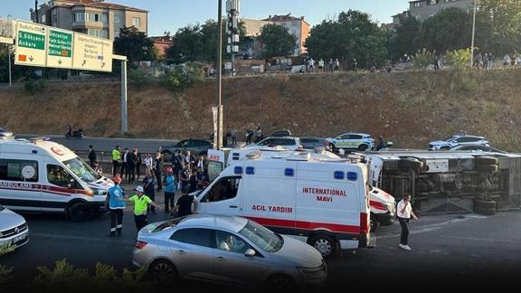 Alınan bilgiye göre, Ümraniye Çamlıca Anadolu Kavşağı'nda seyir halinde olan ve banka çalışanlarını taşıyan 34 LAF 264 plakalı servis aracı devrilerek yan yattı.