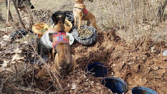 Ekiplerce bir evin çevresinde yapılan aramalarda, arazide gömülü 29 kilogram kubar ve 14 kilogram toz esrar ele geçirildi.