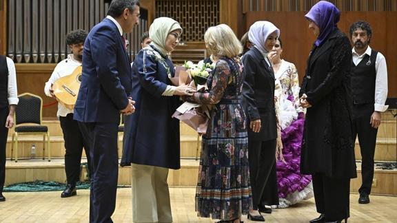 Emine Erdoğan, gösterinin ardından Sevilla Cristina Heeren Flamenko Sanatı Vakfı Başkanı Cristina Heeren'e ve dansçılara çiçek takdim etti.