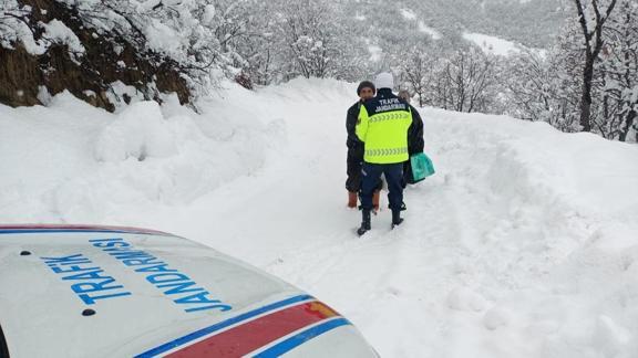 İhbar üzerine harekete geçen jandarma trafik timi, yoğun kar ve tipi nedeniyle kapanan yolu aşarak köye ulaştı.