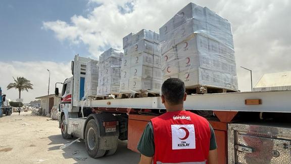 İlk günden bu yana başta gıda olmak üzere Gazze'ye insani yardım desteğini sürdüren Kızılay, Filistin Kızılayı ile de dayanışma halinde çalışıyor.