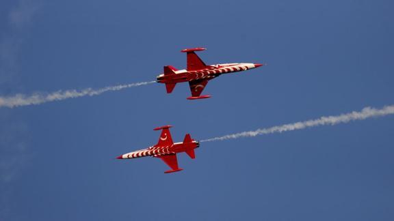Türk Yıldızları gösterilerine gökyüzünde dumanla ay yıldız çizerek başladı. Ekip yarım saatlik uçuş boyunca akrobatik hareketler sergiledi.