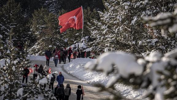 Kent merkeziyle Sarıkamış ilçesinden otobüslerle zirveye ulaşan katılımcılar, Türk bayraklarıyla yürüyerek toplanma alanına geldi. Vatandaşlar, Kızılçubuk bölgesinde şehitler anısına yapılan kardan heykellerin önünde fotoğraf çektirdi.