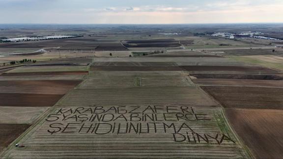 Traktörüne Türk ve Azerbaycan bayrakları asan Tunçkol, pullukla toprakta iz bırakarak yaklaşık 5 saatte "Karabağ Zaferi 5 yaşında, binlerce şehidini unutma dünya" yazdı.