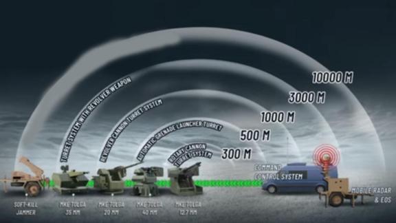MKE'nin "Drone Kubbesi" tasarımının klasik hava savunmanın katman mantığını çok alçak irtifa bandına indirdiğine işaret eden İlhami Keleş, "Merkezde komuta-kontrol (C2) bulunuyor, radar ve optik/videotracking zinciriyle hedef tespiti ve tahsisi yapılıyor, ilk temas yaklaşık 10 km'de soft-kill ile deneniyor. Tehdit devam ettiğinde 3 km'de MKE'nin tek namluda dakikada 1,100 atıma ulaşan yeni 35 mm çözümü parçacıklı mühimmatla devreye giriyor, 1,000 m'de 20 mm, 500–800 m'de 40 mm, 30–300 m'de 12,7 mm ile ardışık angajman tamamlanıyor. Mimari, Türkiye'nin mevcut radar ve C2 altyapılarıyla modüler entegrasyon için tasarlanmış durumda, sabit tesis güvenliğinden mobil konuşlanmaya kadar farklı senaryolara uyarlanabiliyor." şeklinde konuştu.