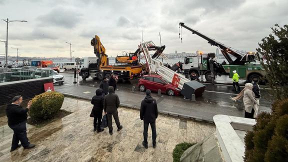 Üsküdar Harem Sahil Yolu'nda ilerleyen tırın üzerinde bulunan ekskavatör, yol takına çarptı.