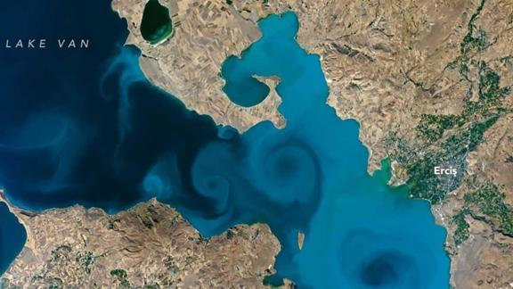 NASA astronotunun uzaydan çektiği fotoğrafta Erciş Körfezi'ndeki akıntıları çok net bir şekilde görebiliyor. Uzaydan bakıldığında başka hiçbir gölde görmenin mümkün olmadığı bu akıntı izleri sudaki soda miktarının bol olmasından kaynaklanırken, oluşan beyazlık görsel bir şölene dönüşüyor.