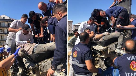 Van''ın Edremit ilçesinde ayağı harç karma makinesine sıkışan işçi, itfaiye ekipleri tarafından kurtarıldı.