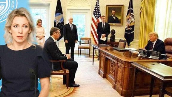 Sırbistan Cumhurbaşkanı Aleksander Vucic’in ABD Başkanı Donald Trump’ın ABD Başkanı Donald Trump'ın Oval Ofis’te düzenlediği basın toplantısında, Kosova lideri Avdullah Hoti ile ticaret anlaşma imzalaması Rus Dışişleri Sözcüsü Mariya Zaharova ile Sırbistan lideri arasında atışmaya neden oldu. Sırbistan Cumhurbaşkanı Vucic’in, Trump tarafından uzak mesafede bir sandalyeye oturulmasını Facebook hesabından eleştiren Mariya Zaharova, “Sorguya çekilircesine, kendini üstün gören birinin karşısına oturtulduğunuzda tavsiyem ‘Temel İçgüdü’ filmindeki pozu almanızdır” diye yazdı.