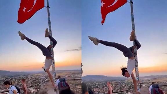 UNESCO Dünya Kültürel ve Doğal Mirası Listesi'nde yer alan Kapadokya bölgesinin önemli destinasyonları arasında yer alan Uçhisar Kalesi'nin zirvesinde yabancı bir turist, Türk bayrağı direğine uygunsuz hareketlerde bulundu.
