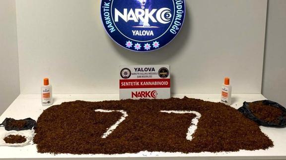 Şüphelilerin evlerinde dedektör köpekler eşliğinde yapılan aramalarda, 1 kilo 574 gram sentetik uyuşturucu, 107 hap, 68 gram uyuşturucu ham maddesi, 2 şişe kimyasal sıvı ele geçirildi.