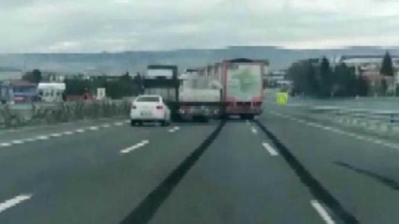Ankara'da sürücüleri trafikte birbirine yol vermemek için inatlaşan iki TIR'ın çarpıştığı kaza cep telefonu ile görüntülendi.