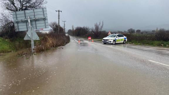 Yağış nedeniyle Ayvacık ve Küçükkuyu arasındaki bağlantı yolu kapandı, sürücüler su birikintileri nedeniyle trafikte ilerlemekte güçlük çekti.