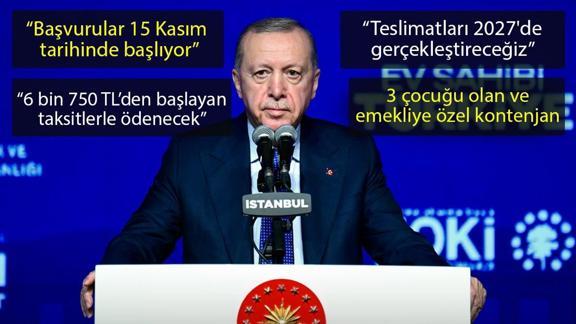 Cumhurbaşkanı Erdoğan, "Bugün yeni umutlarla, yediden yetmişe tüm vatandaşlarımızı heyecanlandıran yeni konut hamleleriyle güzel İstanbul'umuzdayız. Bu eşsiz gururu beraber paylaştığımız her bir kardeşime 'Hoş geldiniz, şeref verdiniz, sefalar getirdiniz.' diyorum. Yalnızca İstanbul için değil, ülkemiz için de bir dönüm noktası olacak bu projemizin detaylarını birazdan sizlerle paylaşacağım. Türkiye'nin en büyük sosyal devlet projelerinden birini daha hayata geçirmeye başlayacak ve hep beraber 'Ev sahibi Türkiye' diyeceğiz." ifadelerini kullandı.