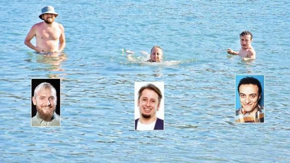 Sezonun yorgunluğunu denize girerek atan yakın arkadaşlar yaklaşık bir saat suda kaldı. Yüzme bilmeyen Hamza Yazıcı’ya rol arkadaşları Cem İşçiler ve Cihan Talay yüzme dersi verirken aralarındaki renkli görüntüler objektiflere yansıdı. Öte yandan Cihan Talay’ın denize şapkayla girmesi dikkatlerden kaçmadı.